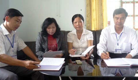| Tại buổi làm việc với BGH, cô Huyền (thứ 3 bên trái sang) đã khẳng định nội dung mình bị tố cáo là sai sự thật, là vu khống. |