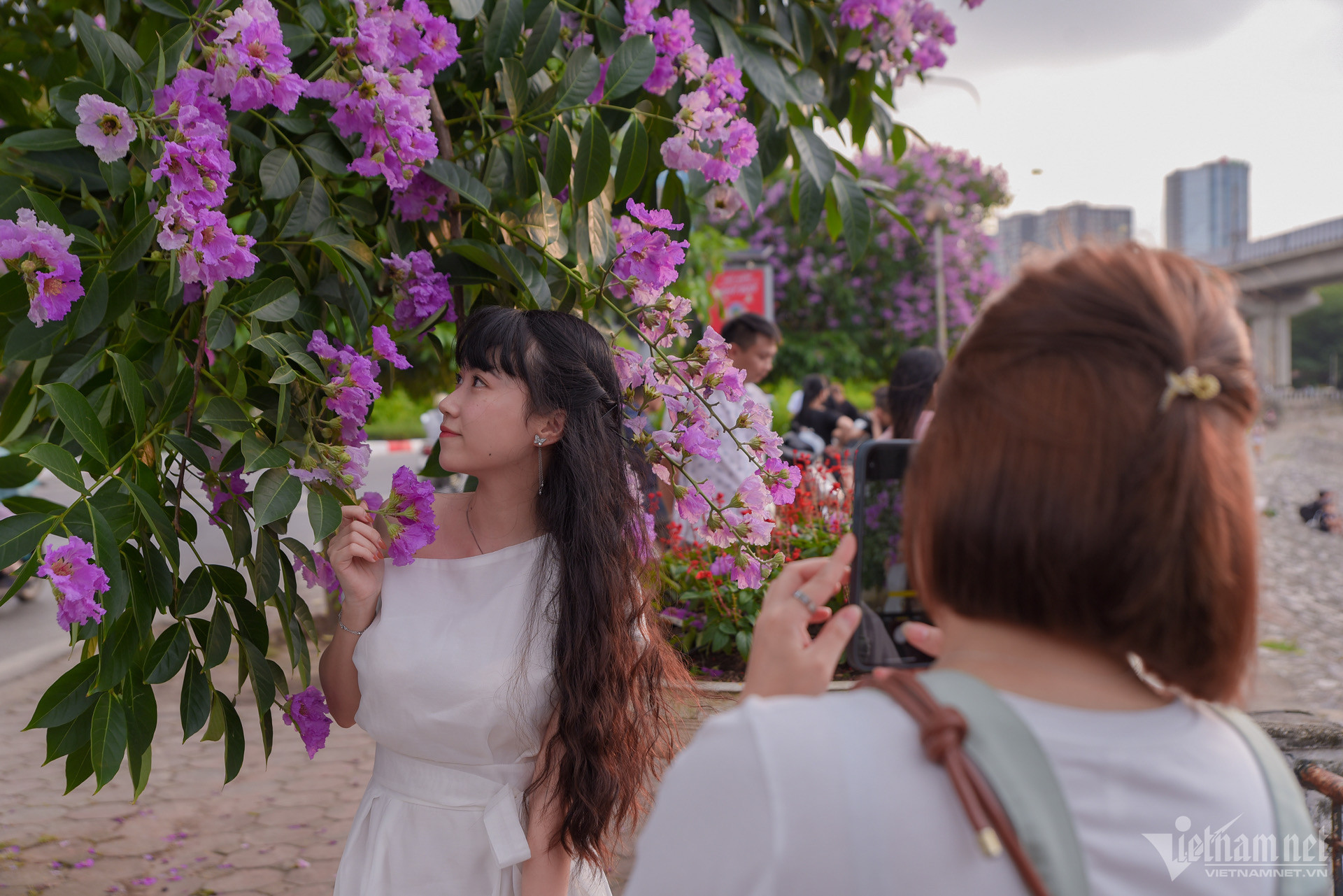 Những cây bằng lăng ven hồ Hoàng Cầu có tán khá thấp, hoa nở đồng đều nên thuận lợi cho người dân, du khách chụp ảnh. Ngoài sắc tím của bằng lăng, tại khu vực này, các "nàng thơ" có thể tạo dáng bên ghế gỗ ven hồ, hàng xe đạp, xa xa là tàu điện trên cao...
