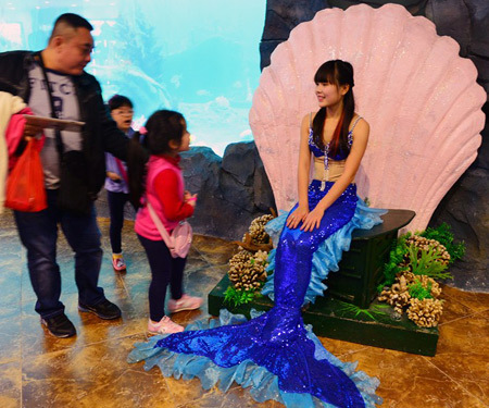 Trong ảnh là Phạm Cẩm Vân (sinh năm 1992), người chuyên đóng vai nàng tiên cá trên cạn. Cô gái người Kiến Xương, Thái Bình này được tuyển vào làm nàng tiên cá mỗi ngày từ 10-30 phút cho khách chụp ảnh, tùy theo đông hay vắng. Vân từng là sinh viên đại học Thủy Lợi, bơi tốt, nhưng nhiệm vụ của Vân là ngồi trên ghế sò ngay khu vực cửa ra của thủy cung. |