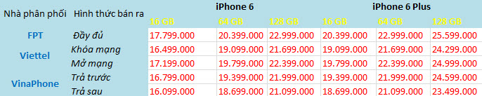 Như ICTnews đã đưa tin, giá iPhone 6 / 6 Plus chính hãng của các nhà phân phối chính FPT và 2 nhà mạng VinaPhone và Viettel hiện như sau: