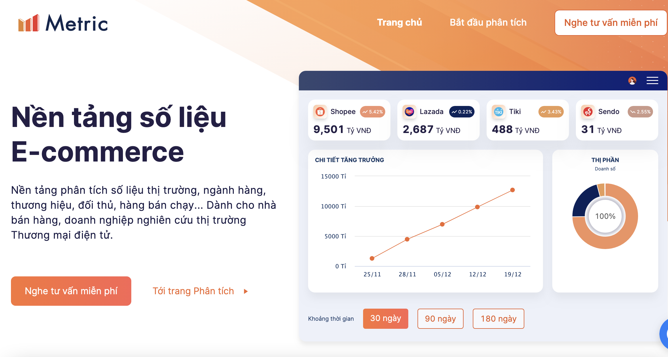 Đây là Nền tảng số liệu thương mại điện tử dành cho doanh nghiệp, thương hiệu và nhà bán. Metric tạo ra báo cáo phân tích dữ liệu thị trường chỉ trong 30 giây, giúp việc thực thi và ra quyết định kinh doanh nhanh hơn 5 lần.