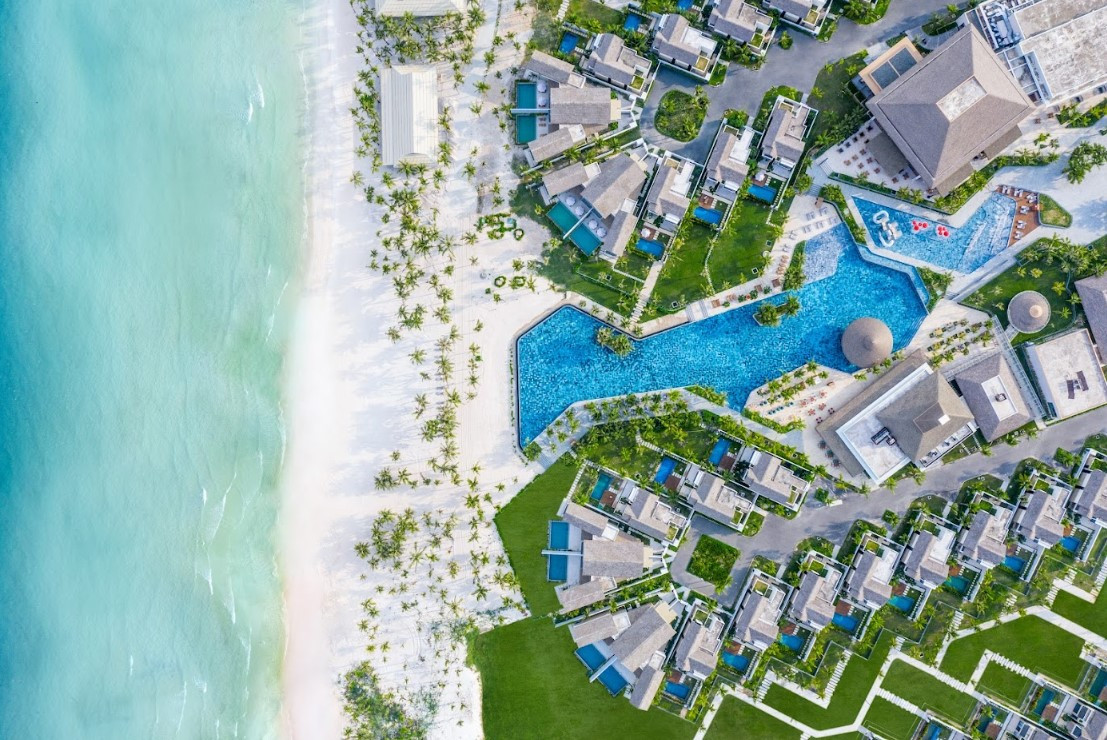 New World Phu Quoc Resort sở hữu cơ sở vật chất rộng rãi và mới mẻ, với diện tích 60ha, tọa lạc tại Bãi Kem - top 50 bãi biển đẹp nhất thế giới (theo Fight Network). Khu nghỉ dưỡng còn phủ xanh toàn bộ diện tích với 8.000 cây dừa, tạo không gian mát mẻ cho du khách. Nếu nhìn từ trên cao, nơi đây hiện lên như một bức tranh với những mảng dừa xanh trù phú, xen lẫn mái lá từ 375 căn biệt thự với hồ bơi riêng, hứa hẹn mang lại khoảng thời gian thư thái, bình yên trong suốt kỳ nghỉ của các gia đình.