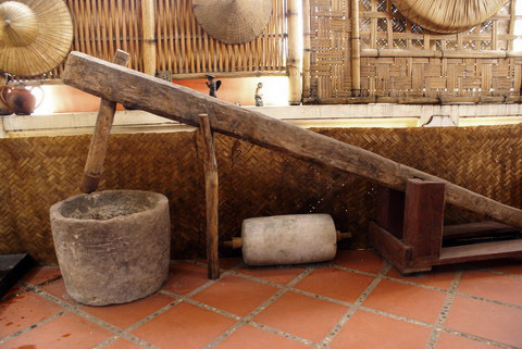 Chiếc cối xay lúa này được làm từ tre và đất nện - là dụng cụ người nông dân dùng để tách vỏ trấu ra khỏi hạt gạo