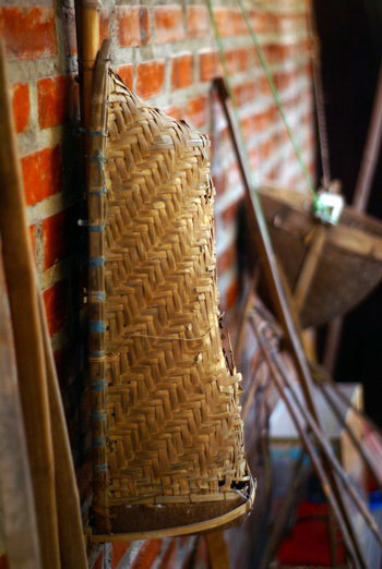 chiếc gàu vảy, được đan bằng tre, dùng để tát nước ở ruộng. Phía sau nó
