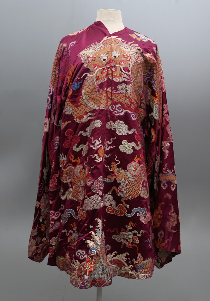 Áo Nhật Bình có niên đại khoảng cuối thế kỷ XIX đầu thế kỷ XX. Nhìn chung, đây là chiếc áo của bậc cung tần bậc cao trong cung, màu sắc và trang trí độc đáo, là hiện vật quý hiếm và có giá trị. Họa tiết trang trí chính của áo là kiểu “Đoàn loan hàm thọ” (hai chim loan bố trí trong hình tròn gắn với chữ “thọ”) được bố trí cùng với mô típ bát bửu và hoa lá khá đều đặn ở trước và sau áo. Ảnh: invaluableCài cổ áo là hai miếng kim loại hình chữ nhật, màu trắng đã bị ô xy hóa. Hai bên chính giữa cổ áo thêu hoa văn thủy ba và hình bốn chim loan. Ảnh: Nguyễn Phước Hải Trung