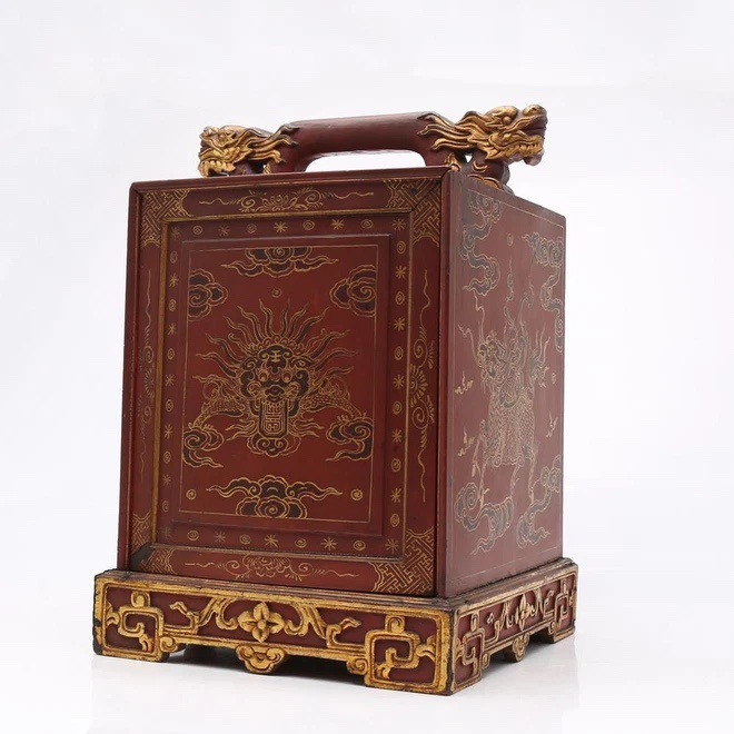 Hộp đựng mũ hình khối chữ nhật đứng, bằng gỗ, có đế, làm theo mô típ cung đình, bốn mặt vẽ tứ linh. Đế hộp chạm trổ dây hoa lá cách điệu, bốn mặt đều như nhau tạo thế chân quỳ. Quai hộp được chạm trổ hai đầu rồng ở hai đầu, toàn bộ hộp gỗ được sơn son thếp vàng. Ảnh Balclis