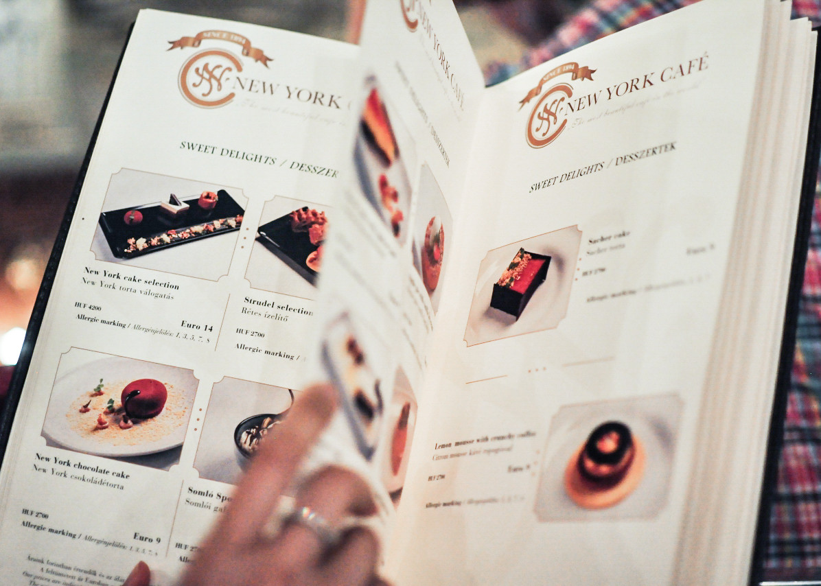 Quán cà phê 129 tuổi này được trang trí theo phong cách Phục hưng của Ý với trần nhà cao, các bức bích họa của các danh họa nổi tiếng Gusztav Mannheimer và Ferenc Eisenhut. Bên cạnh đó, trần của New York Café phủ đầy đèn thủy tinh nhập từ Venice lấp lánh, lan can chạm khắc, cột đá cẩm thạch và các thiên thần được trưng bày khắp nơi.