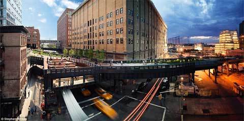 Từ sáng tới tối: Tấm ảnh cho thấy công viên High Line ở New York. Ở phía xa là trụ sở chính IAC của trùm truyền thông Barry Diller phía sông Hudson