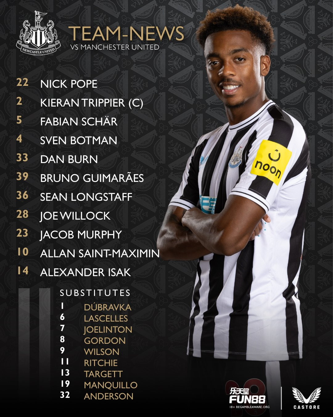 Newcastle: Pope; Trippier, Schar, Botman, Burn; Longstaff, Guimaraes, Willock (Anderson 84'); Saint-Maximin (Joelinton 68'), Isak, Murphy (Gordon 68').