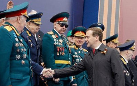 Tổng thống Dmitry Medvedev (phải) bắt tay các cựu chiến binh trước khi