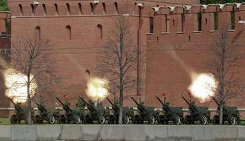 Loạt súng được bắn trên bờ sông Moskva trước tường Kremlin trong một cuộc diễu
