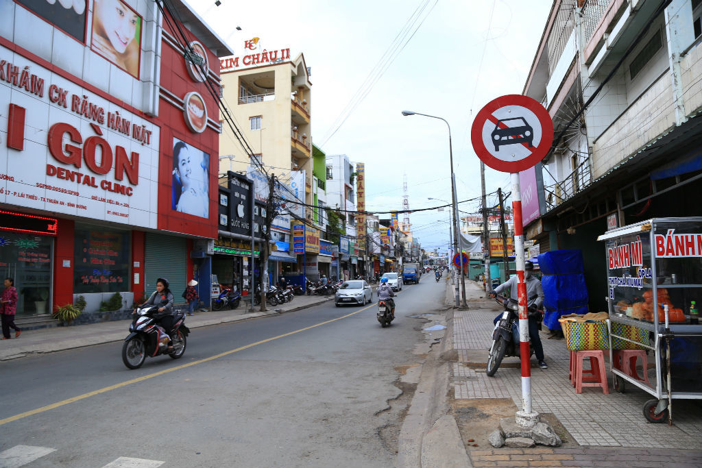 Theo quan sát, khu vực đường Phan Đình Phùng trước cổng chợ Lái Thiêu - nơi chị Ngọc gặp nạn, có gắn biển báo cấm ô tô lưu thông vào con đường này hướng từ cầu sắt Phú Long ra đường Cách Mạng Tháng Tám.