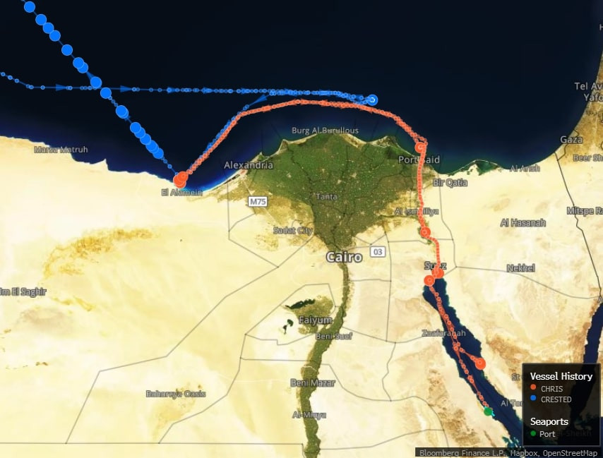 Theo Bloomberg, trong ngày 24/7, một lô hàng gồm 700.000 thùng dầu có xuất xứ từ Nga đã được chuyển tới cảng El Hamra của Ai Cập. Chỉ vài giờ đồng hồ sau đó, toàn bộ số dầu này được di chuyển lên một tàu chở hàng khác, điểm đến của chuyến tàu này vô cùng khó nắm bắt.