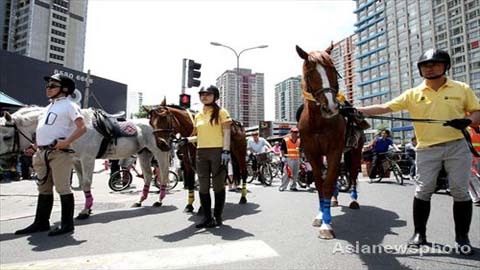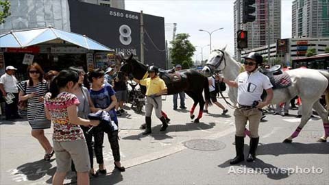 | Nhiều người đi đường tỏ ra thích thú và ngạc nhiên khi trông thấy đoàn người cưỡi ngựa trên đường (Ảnh: Asianewsphoto) |