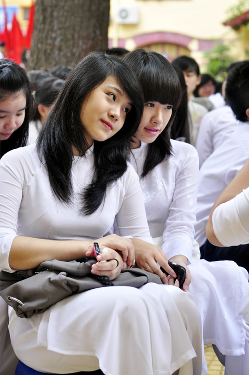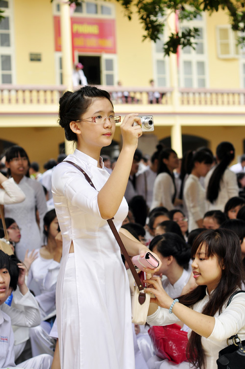 Trong ngày khai giảng năm học mới, các cô gái của trường Việt Đức, Trần Phú, Marie Curie... rạng rỡ trong tà áo dài trắng và mái tóc dài buông xõa.