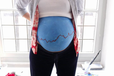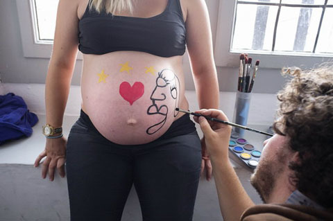 | Họa sỹ Thomas Christoffersen sử dụng bụng bầu của chị Sidsel Gronvald để vẽ tranh (Ảnh: Getty Images) |
