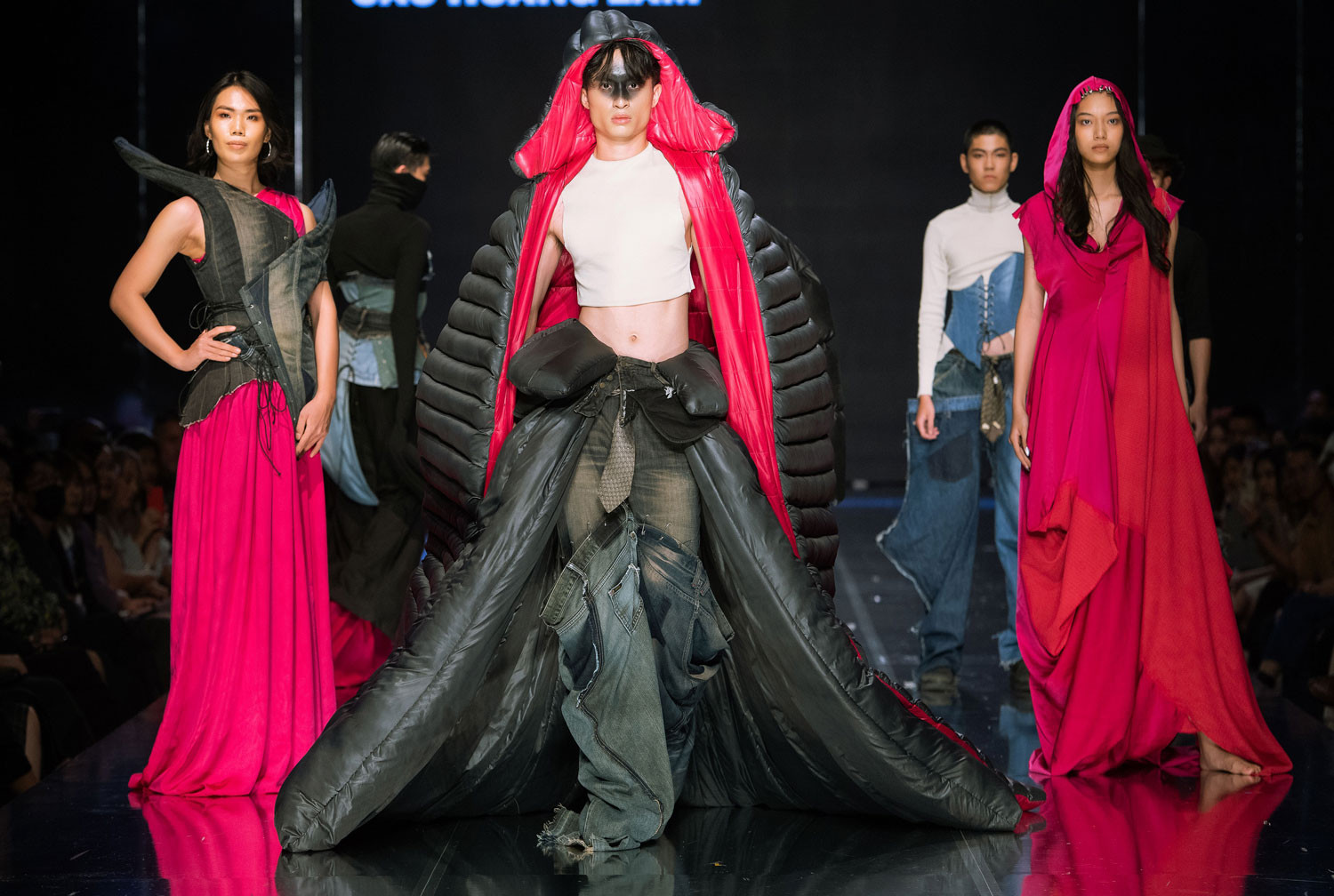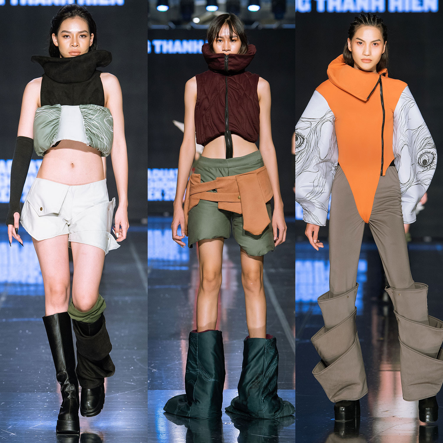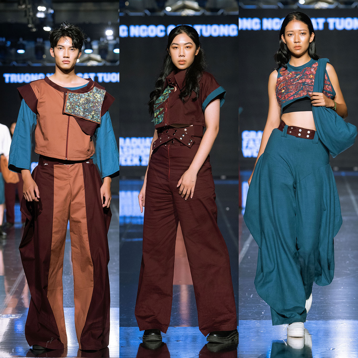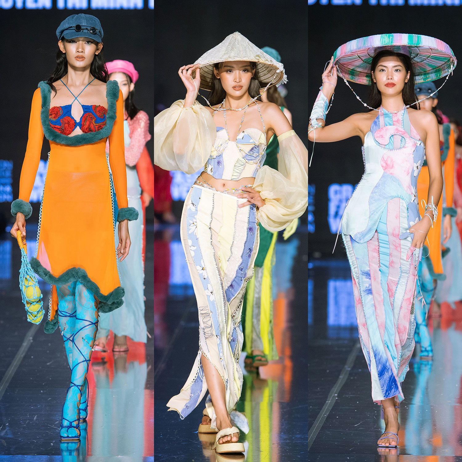 “Thức” của NTK Cát Tường đề cao tinh thần luôn học hỏi, khám phá để phát triển của con người. BST dành cho những ai quan tâm đến sự bền vững và vật liệu sinh học. Các thiết kế có phom dáng đường phố với chất liệu chính là nhựa sinh học cùng vải tái chế.