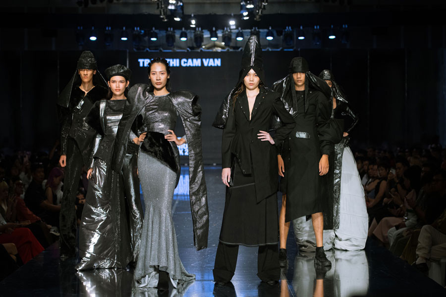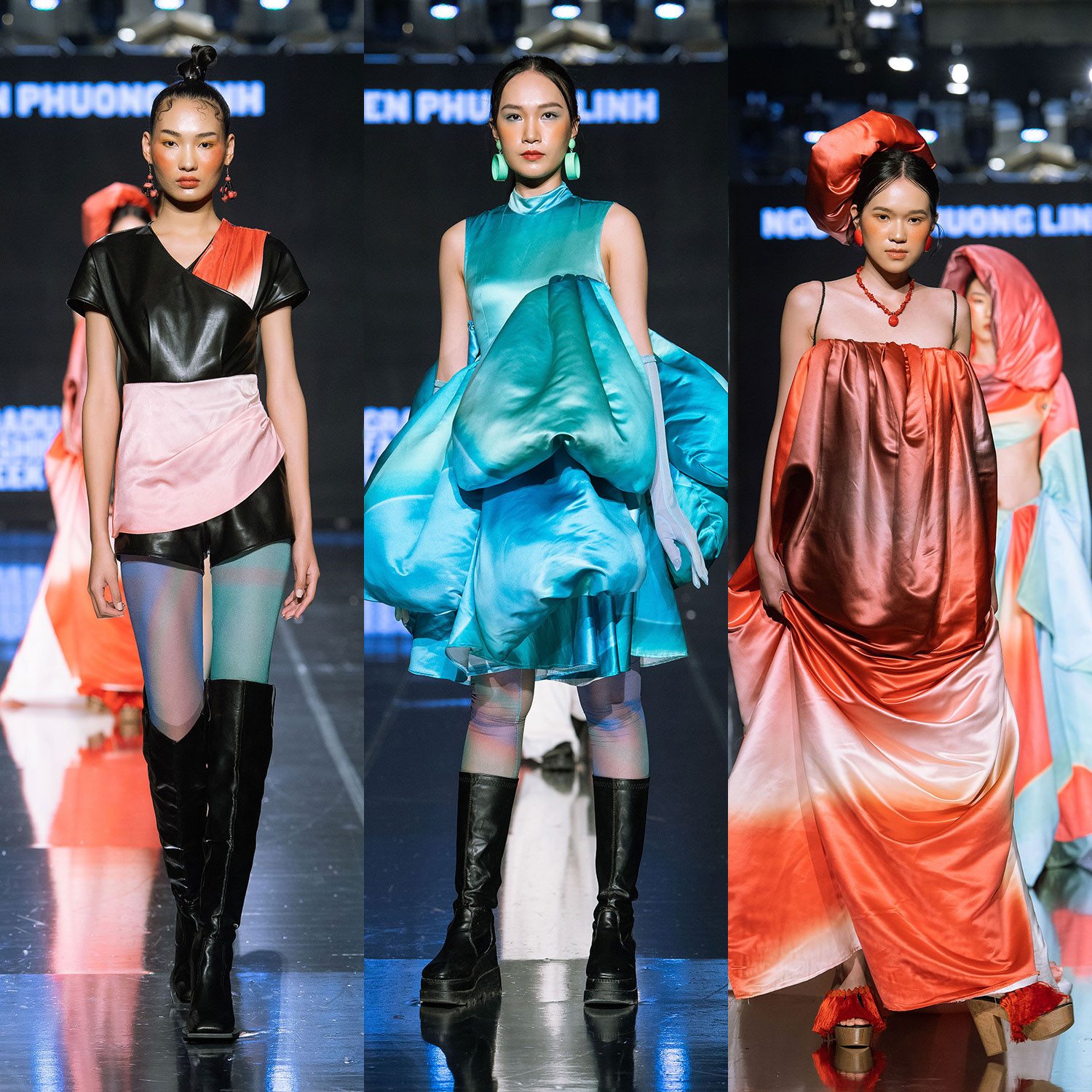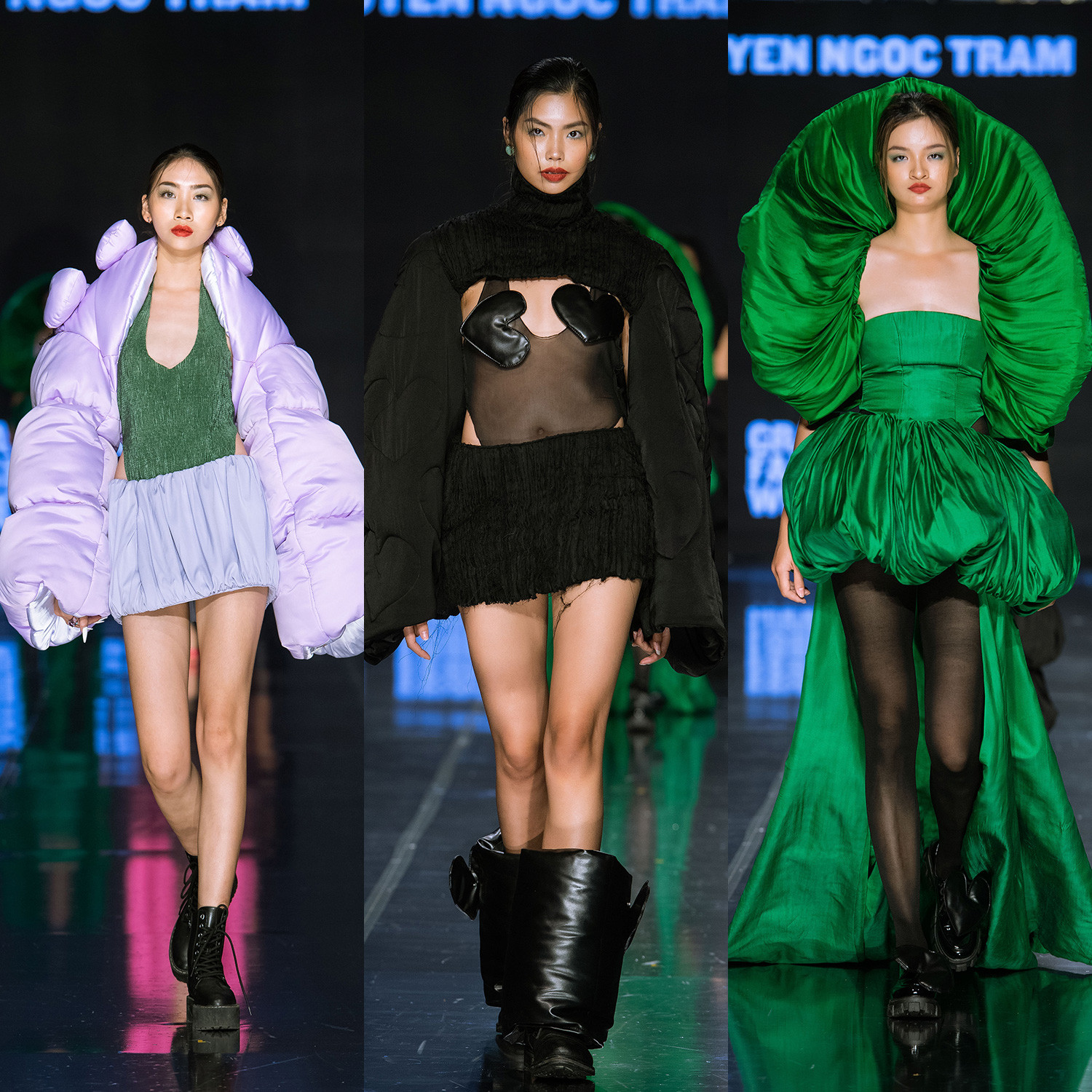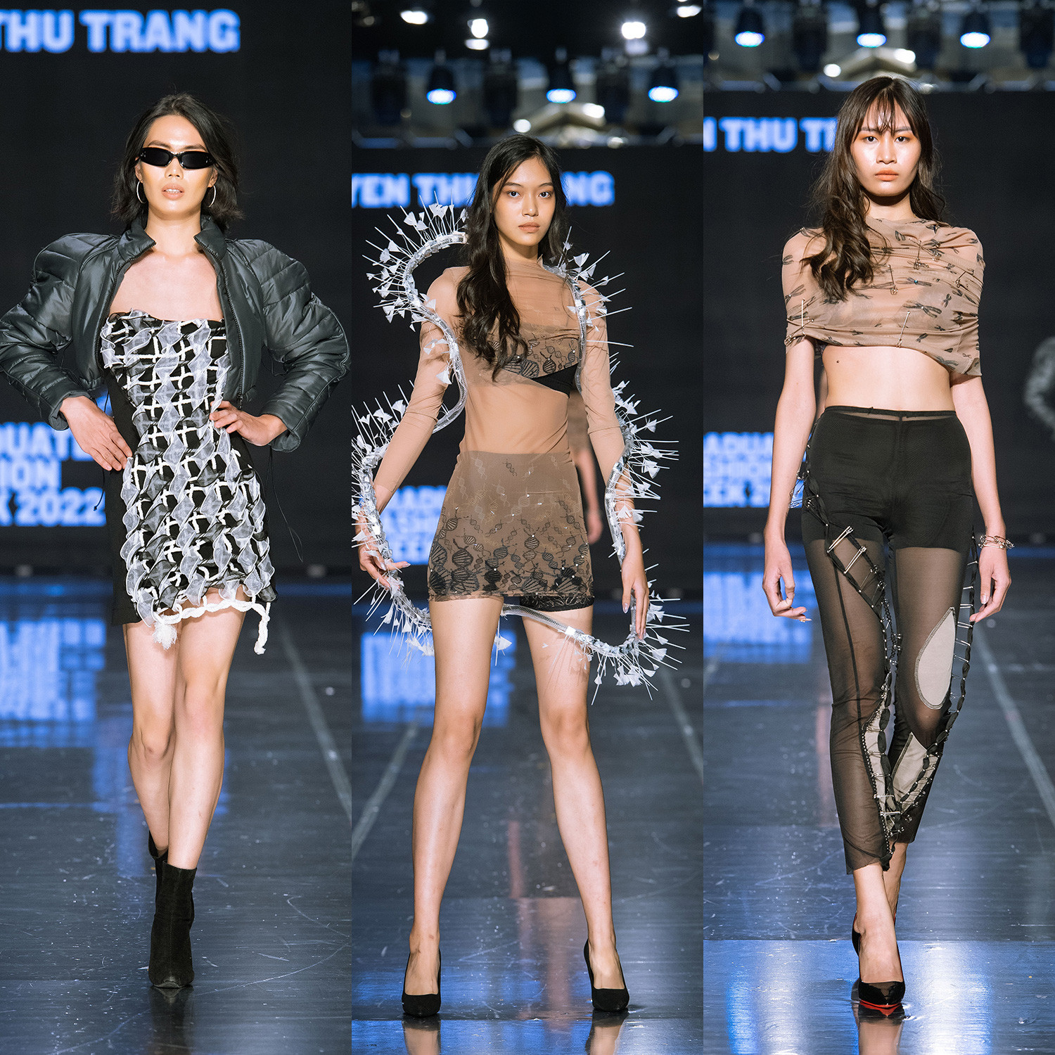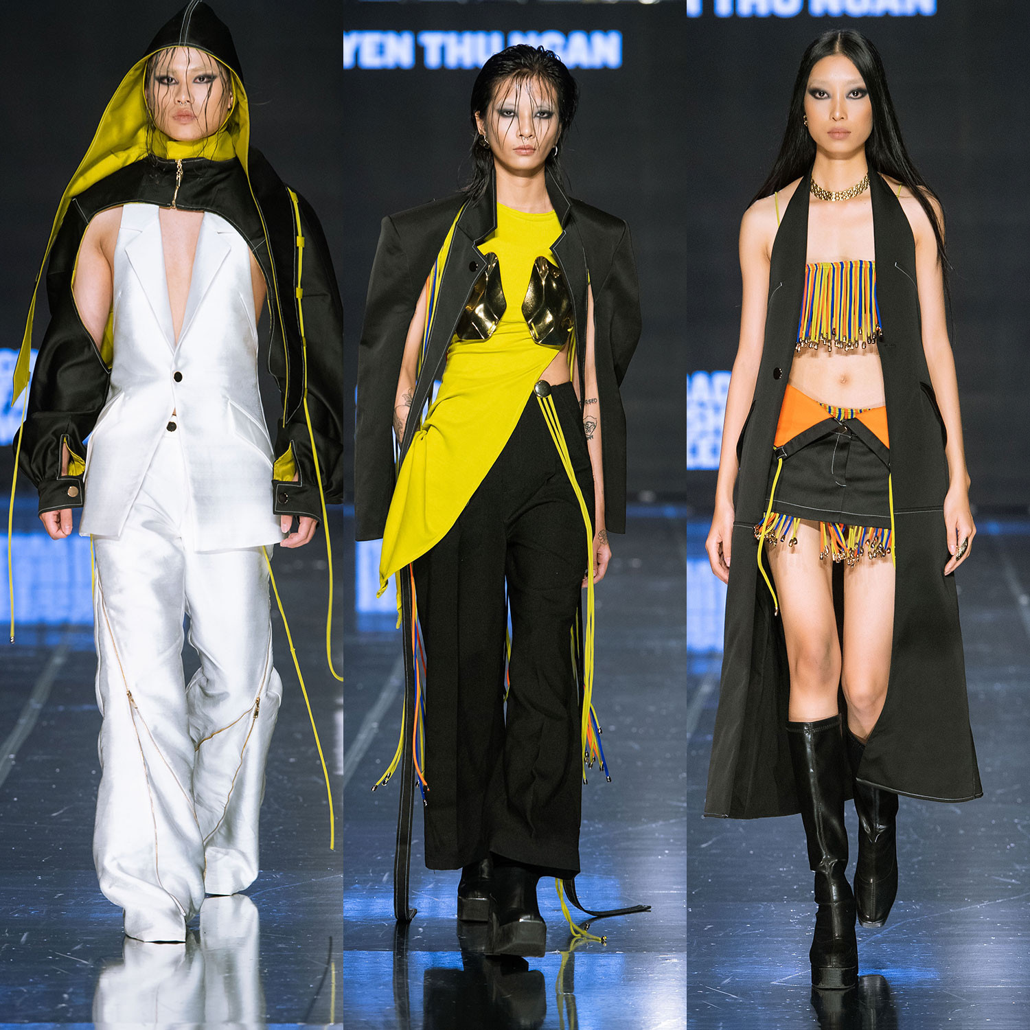 “Thức” của NTK Cát Tường đề cao tinh thần luôn học hỏi, khám phá để phát triển của con người. BST dành cho những ai quan tâm đến sự bền vững và vật liệu sinh học. Các thiết kế có phom dáng đường phố với chất liệu chính là nhựa sinh học cùng vải tái chế.