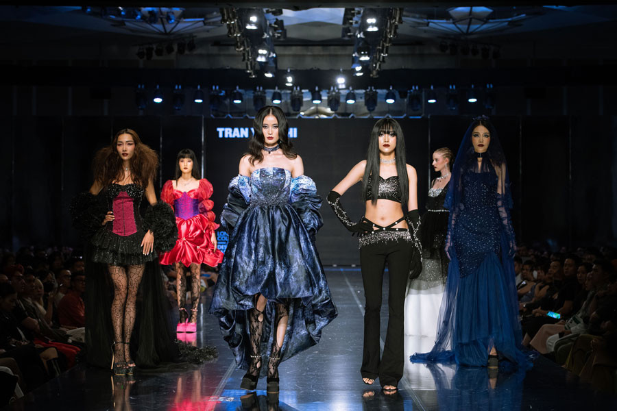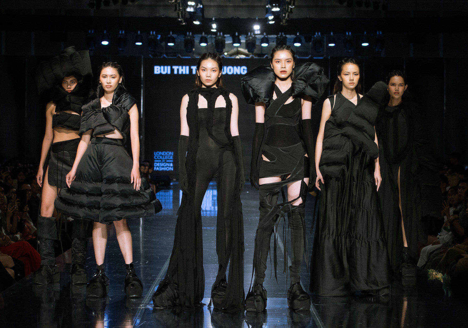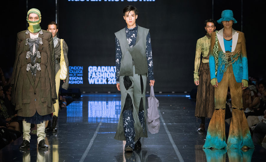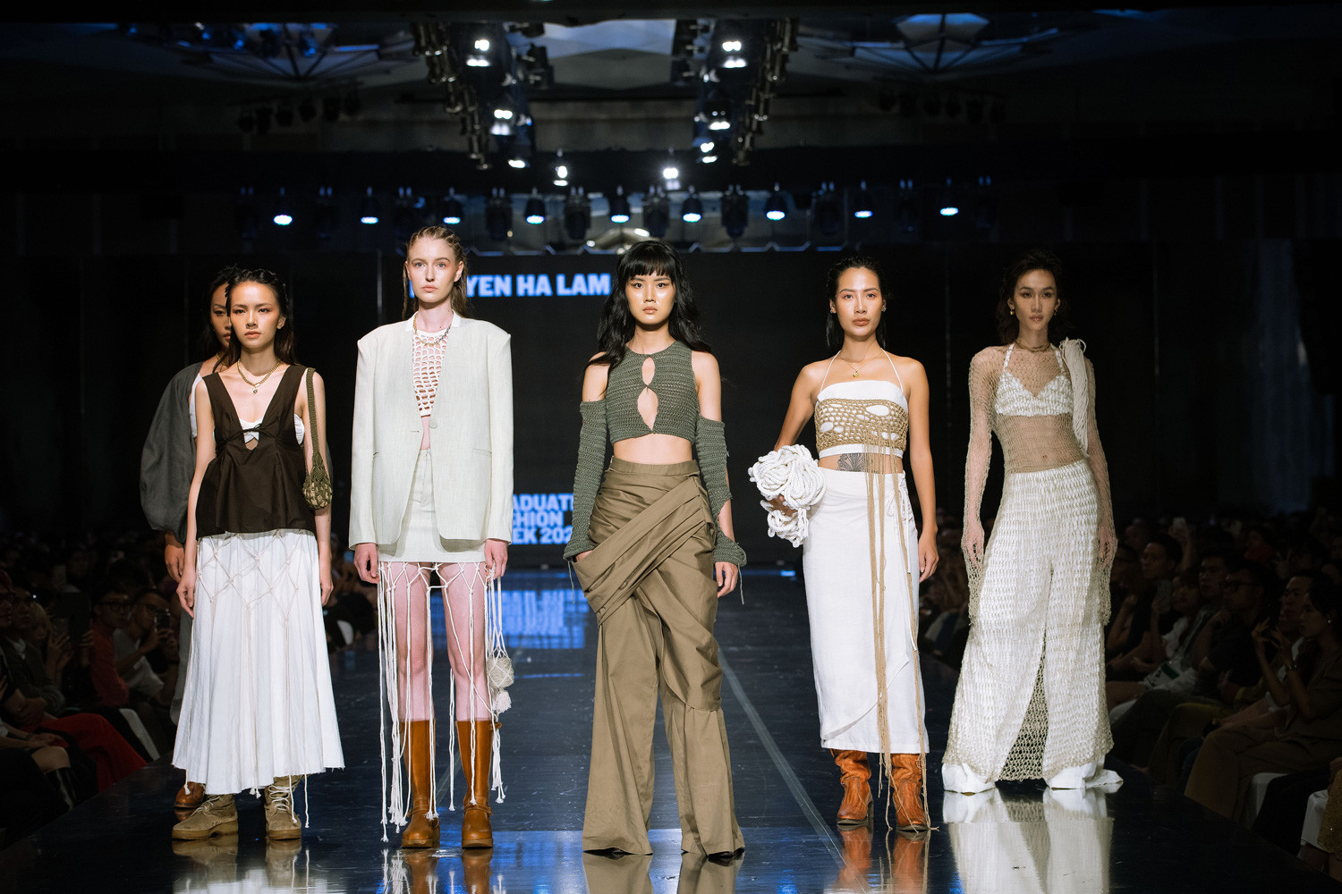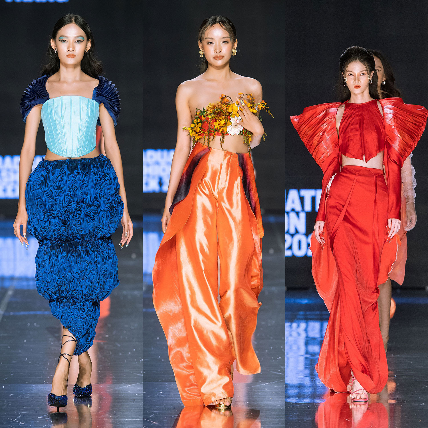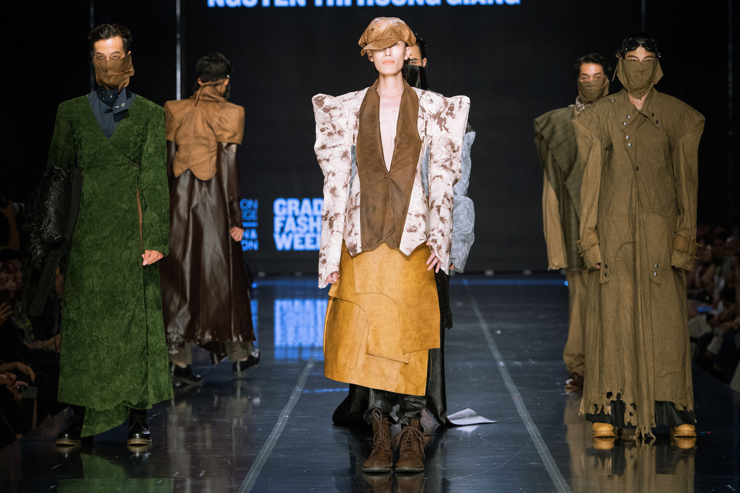 “Thức” của NTK Cát Tường đề cao tinh thần luôn học hỏi, khám phá để phát triển của con người. BST dành cho những ai quan tâm đến sự bền vững và vật liệu sinh học. Các thiết kế có phom dáng đường phố với chất liệu chính là nhựa sinh học cùng vải tái chế.