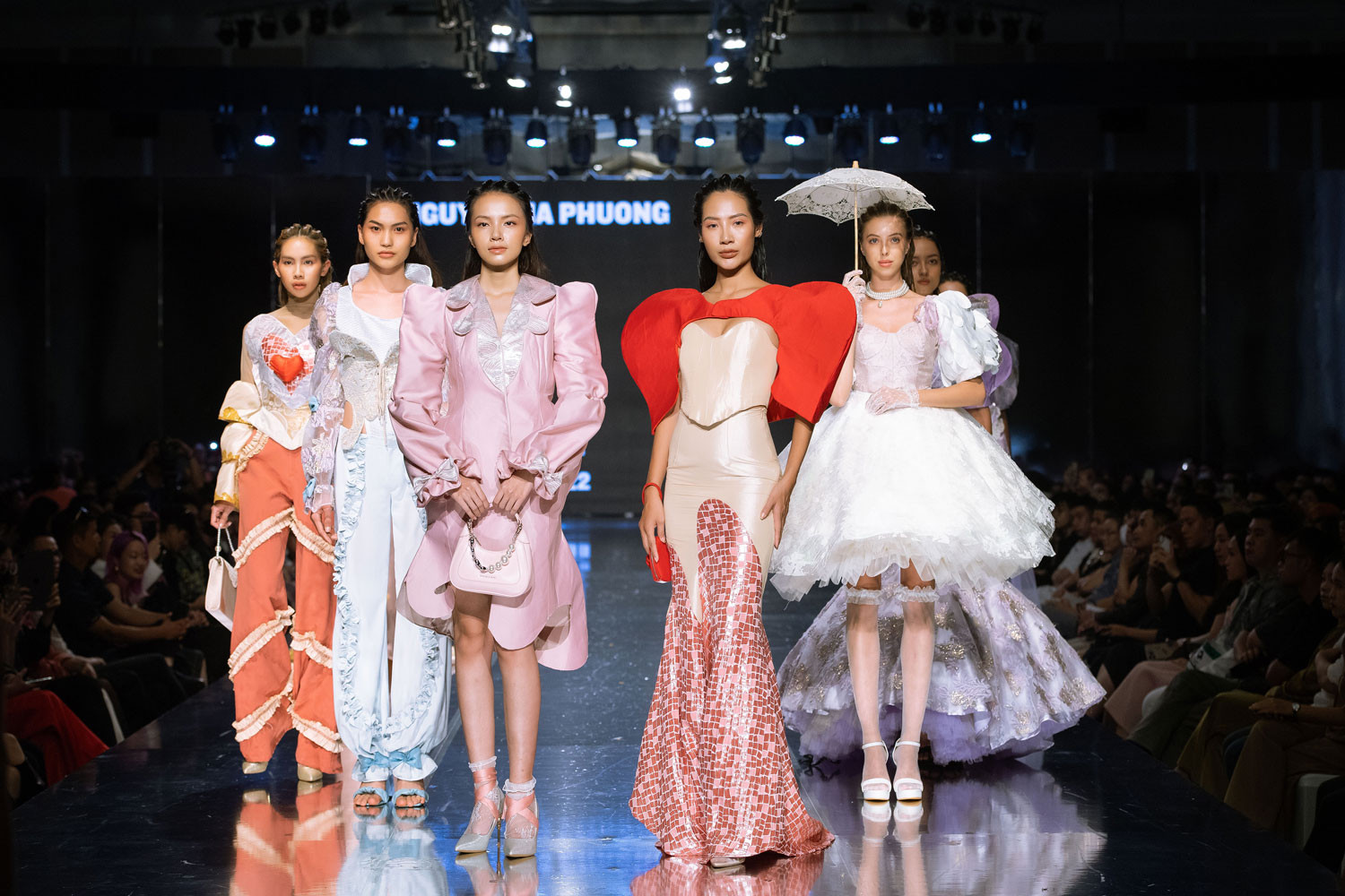 BST "Giai điệu tình yêu/ Melodia D’amore" của NTK Hà Phương mang nhiều dấu ấn của thời kỳ nghệ thuật Rococo Pháp với phom dáng đặc trưng như váy ôm, áo nịt ngực, áo bèo, tay phồng. Hình trái tim - xuất hiện nhiều trong nhiều chi tiết. Màu sắc chủ yếu gồm tông màu pastel tươi sáng.
