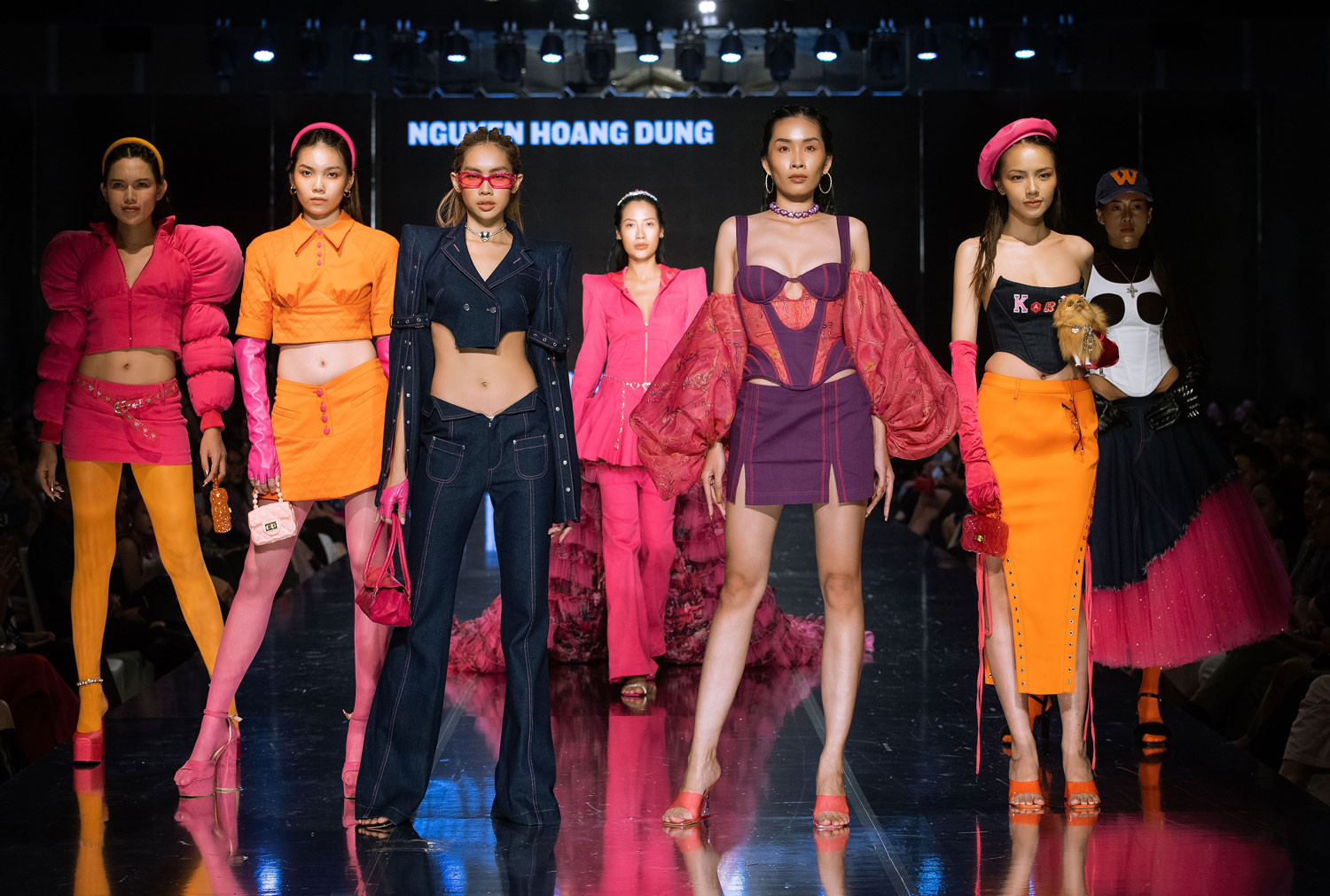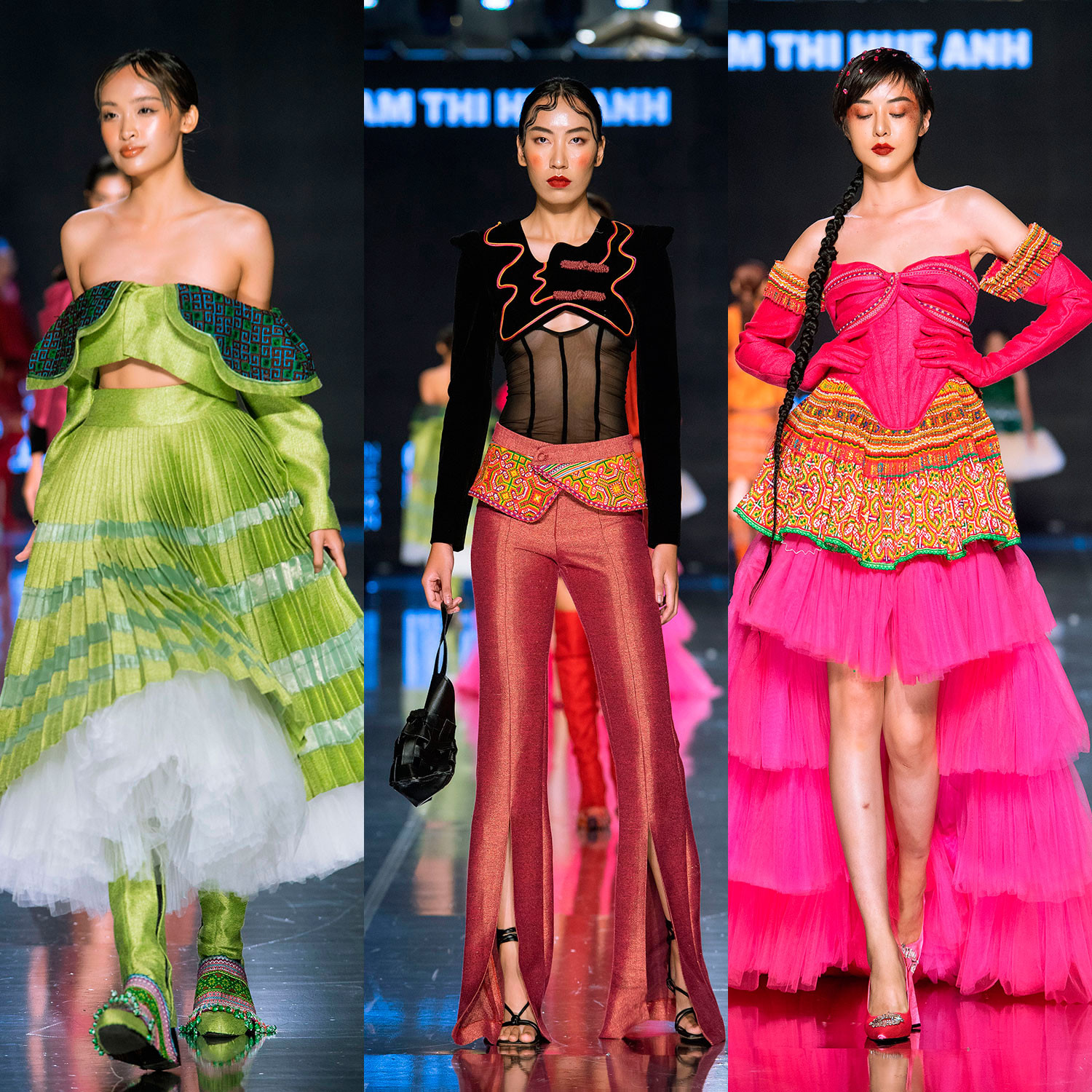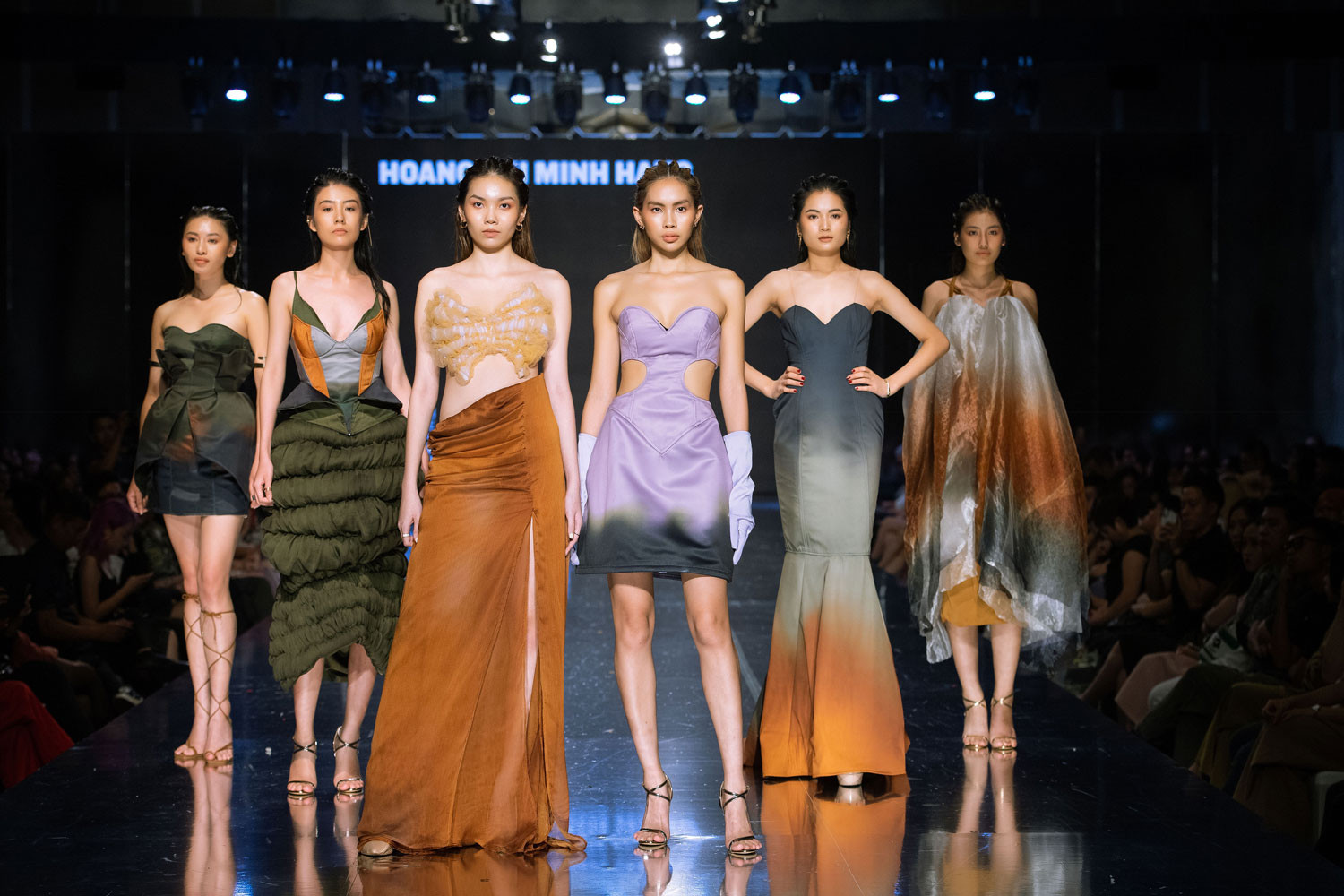 “Nhộng" của NTK Minh Hằng lấy cảm hứng từ sự biến hóa của một con bướm. NTK muốn tôn vinh sức mạnh và vẻ đẹp của một con nhộng trong giai đoạn dễ bị tổn thương để tự hào tung cánh bay trong nắng, như một phép ẩn dụ về sự bứt phá khỏi mọi rào cản của thế hệ trẻ.