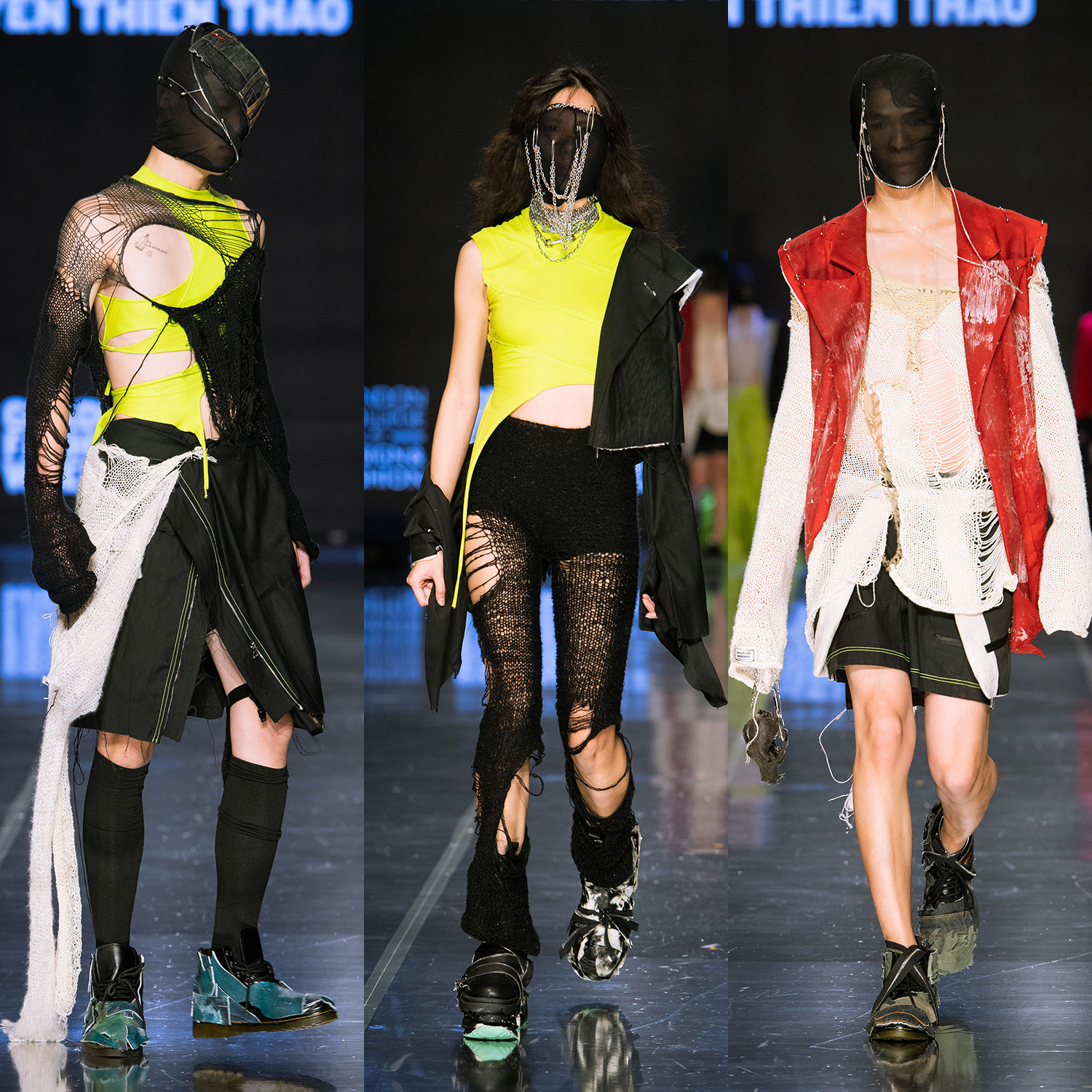BST “Anarchist” của NTK Thiên Thảo phản ánh cái nhìn của nhà thiết kế với ngành công nghiệp thời trang hiện tại. Nó không chỉ thải ra môi trường hàng tấn rác thải mà còn làm kiệt quệ sức sáng tạo của các nhà thiết kế. Bảng màu của bộ sưu tập là biến thể của đen tuyền, đỏ hồng lựu và xanh ô liu mô tả màu sắc trong một lò mổ, được làm nổi bật bởi màu đỏ tươi neon và mơ. Ý tưởng đằng sau các màu sáng này cho thấy vẫn tồn tại hy vọng sau cuộc chiến đẫm máu của ngành thời trang và các nhà thiết kế.