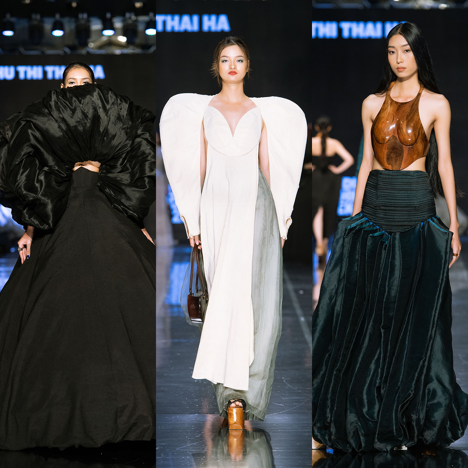 BST “Thị” của NTK Thái Hà xây dựng hình ảnh người phụ nữ tươi mới, mạnh mẽ, độc lập trái ngược với người phụ nữ bị áp đặt bởi những hủ tục thời xưa. BST được lấy cảm hứng từ những trang phục truyền thống với chất liệu shantung, đũi và tơ sống. Sự kết hợp nhiều lớp trong trang phục thể hiện tầng tầng lớp lớp những gian khổ mà người phụ nữ gánh chịu.