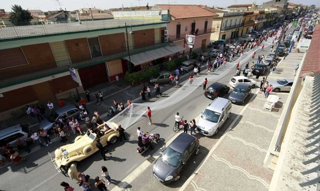 Cô dâu người Italy Elena de Angelis đã quyết định ghi dấu ấn trong ngày trọng đại của mình bằng cách choàng lên đầu chiếc khăn voan dài gần 3 km.