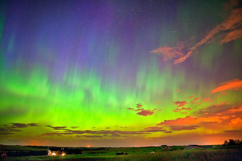 Cực quang màu xanh lục và những đám mây nhuộm màu cam trên bầu trời Calgary, Canada sớm ngày 6.8