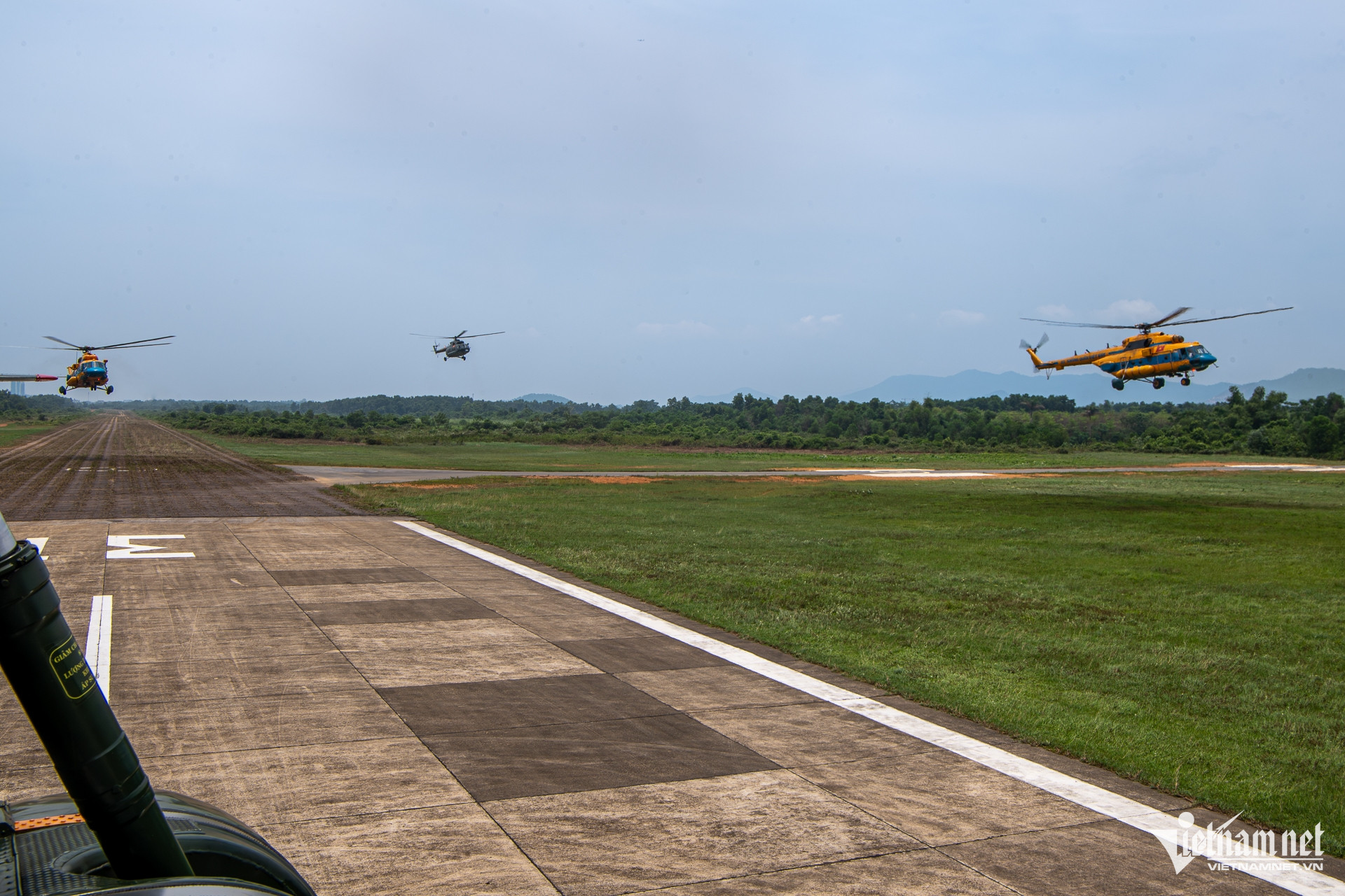 10h30, sân bay Hòa Lạc rung chuyển bởi tiếng động cơ của 10 chiếc Mi-8 và Mi-171, bay theo đội hình 1-3-3-3. Các trực thăng đồng loạt cất cánh, luyện tập bài bay đội hình treo cờ, sẵn sàng cho nhiệm vụ bay trình diễn trong Lễ kỷ niệm 80 năm Cách mạng Tháng Tám và Quốc khánh 2/9.