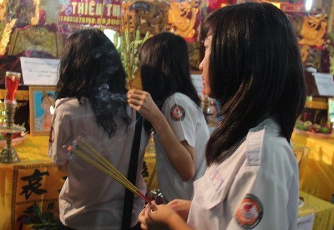 Sáng 25/2 ba bé gái bước vào bên trong vãng sanh đường chùa Vĩnh Nghiêm trong bộ trang phục học sinh với phù hiệu của trường trung học cơ sở Colette. Nhận nắm nhang nghi ngút khói từ tay một đoàn viên thanh niên cả ba tiến vào bên trong. . .