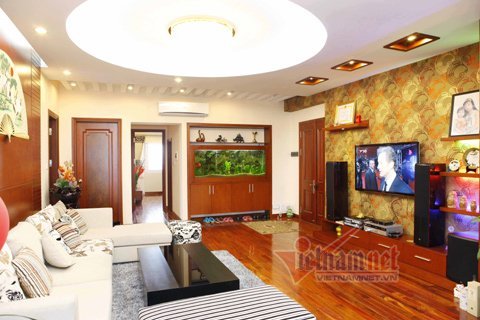 Phòng khách được trang trí với gam màu trầm và có chiếc bể cá phong thủy rất đẹp mắt được đặt ngay ngắn một góc nhà.