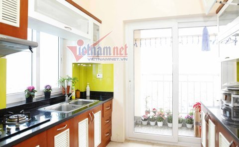 Khu bếp và một ban công nhỏ với nhiều bồn hoa nhỏ sinh động và đẹp mắt.