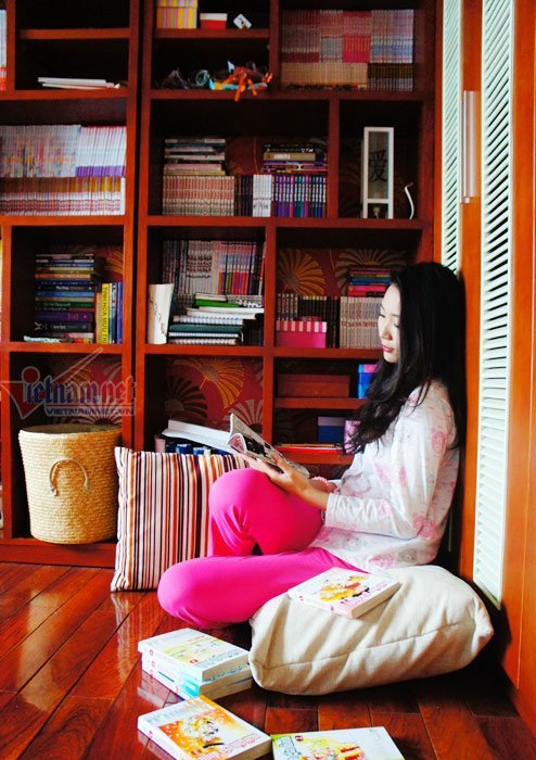 Thùy Trang và phút giây bên tủ sách bày rất nhiều truyện tranh.