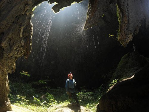 vào sâu 1km, gặp một lỗ thông hơi cao 20m, đi lên lỗ này lại phát hiện một hang