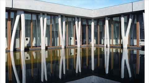 Một đặc điểm của những thiết kế này là cách kết hợp không gian bên trong và bên ngoài cùng nhau. Một hồ bơi nông trong sân của ngôi trường Ecole Internationale de Manosque ở Pháp. (Ảnh: AREA)
