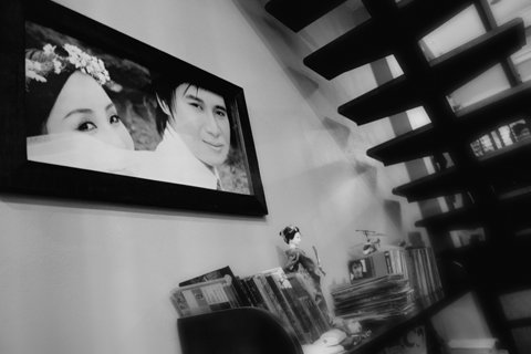 Phía trên là không gian dành cho giá đĩa và bức ảnh cưới rất ấn tượng của Tấn Minh và Thu Huyền