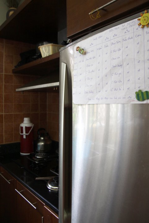 Thực đơn ăn hàng ngày của các con được dán cẩn thên trên cánh tủ lạnh.