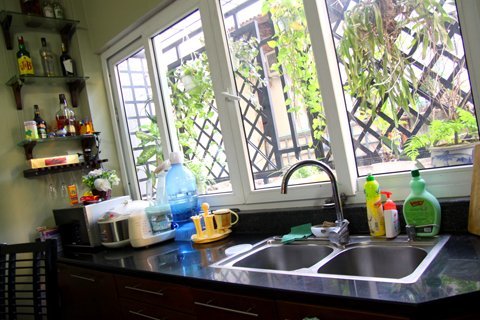 Một cửa sổ lớn được mở ở phòng ăn, nhìn ra không gian rộng phía ngoài với toàn cây xanh do chính hai nghệ sĩ trồng và chăm sóc hàng ngày.