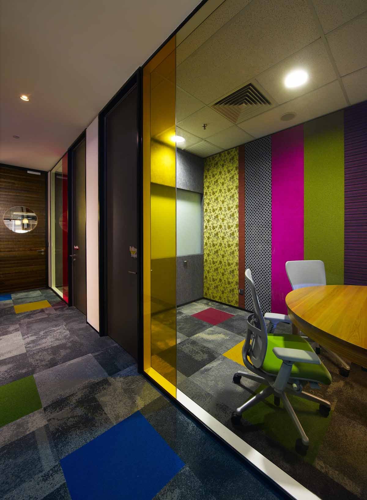 Phòng họp hòa trộn giữa nhiều màu sắc và họa tiết.
