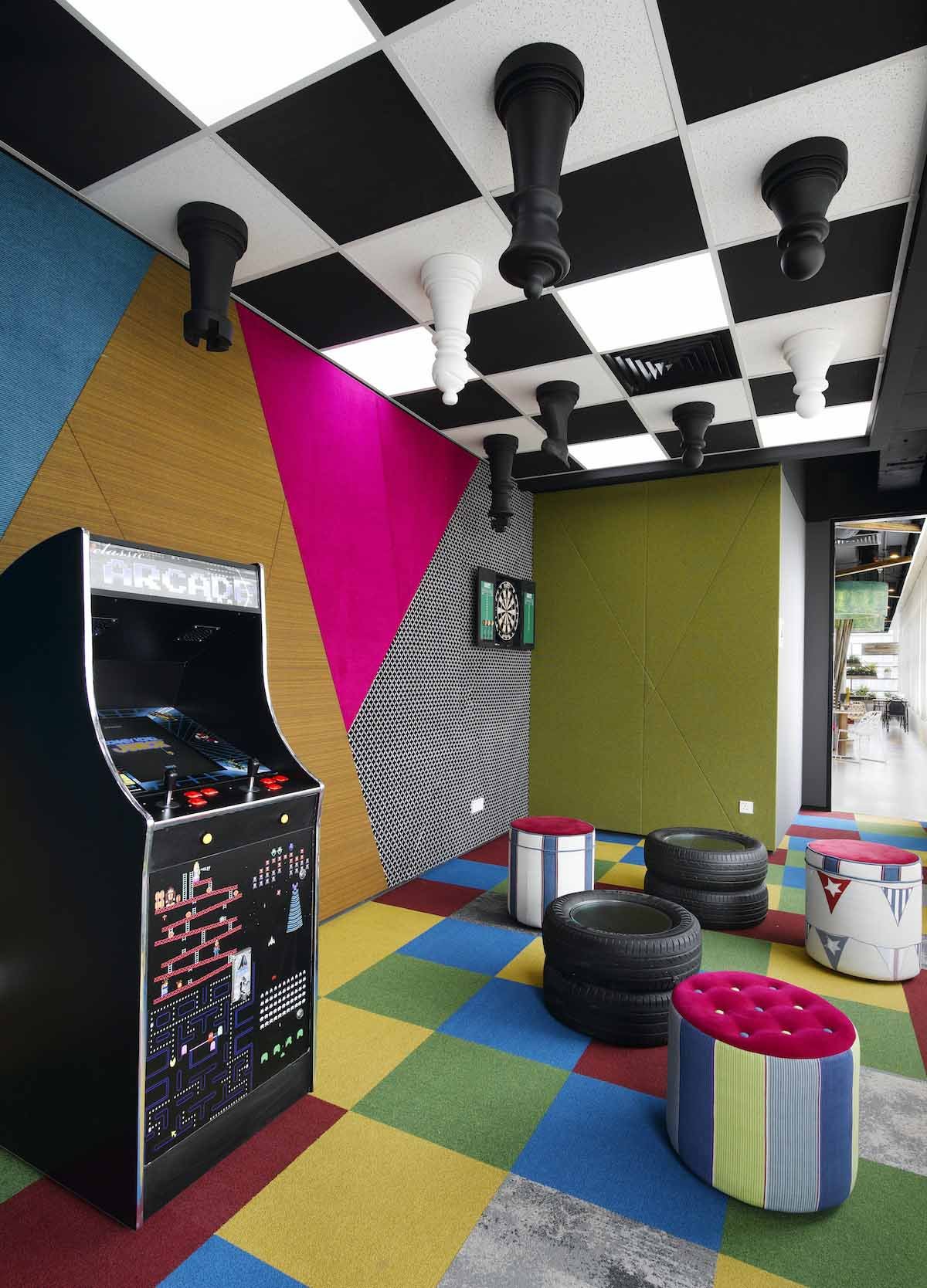 Trần nhà được trang trí bằng bàn cờ vua độc đáo, trong khi phía dưới là lốp xe bỏ đi và máy chơi game arcade.