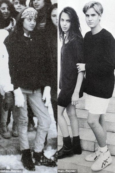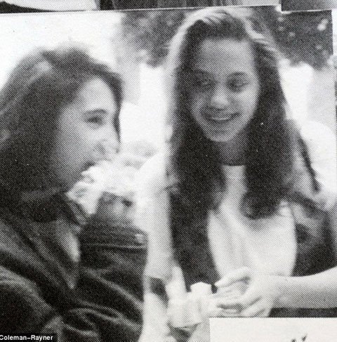 Jolie chụp ảnh cùng các bạn khi đi trượt tuyết ở Yosemite, lúc đó cô khoảng 13 tuổi (trái). Cũng trong khoảng thời gian đó cô chụp ảnh với một người bạn trai cùng lớp và được bạn học bầu chọn là người có đôi chân đẹp nhất (phải).