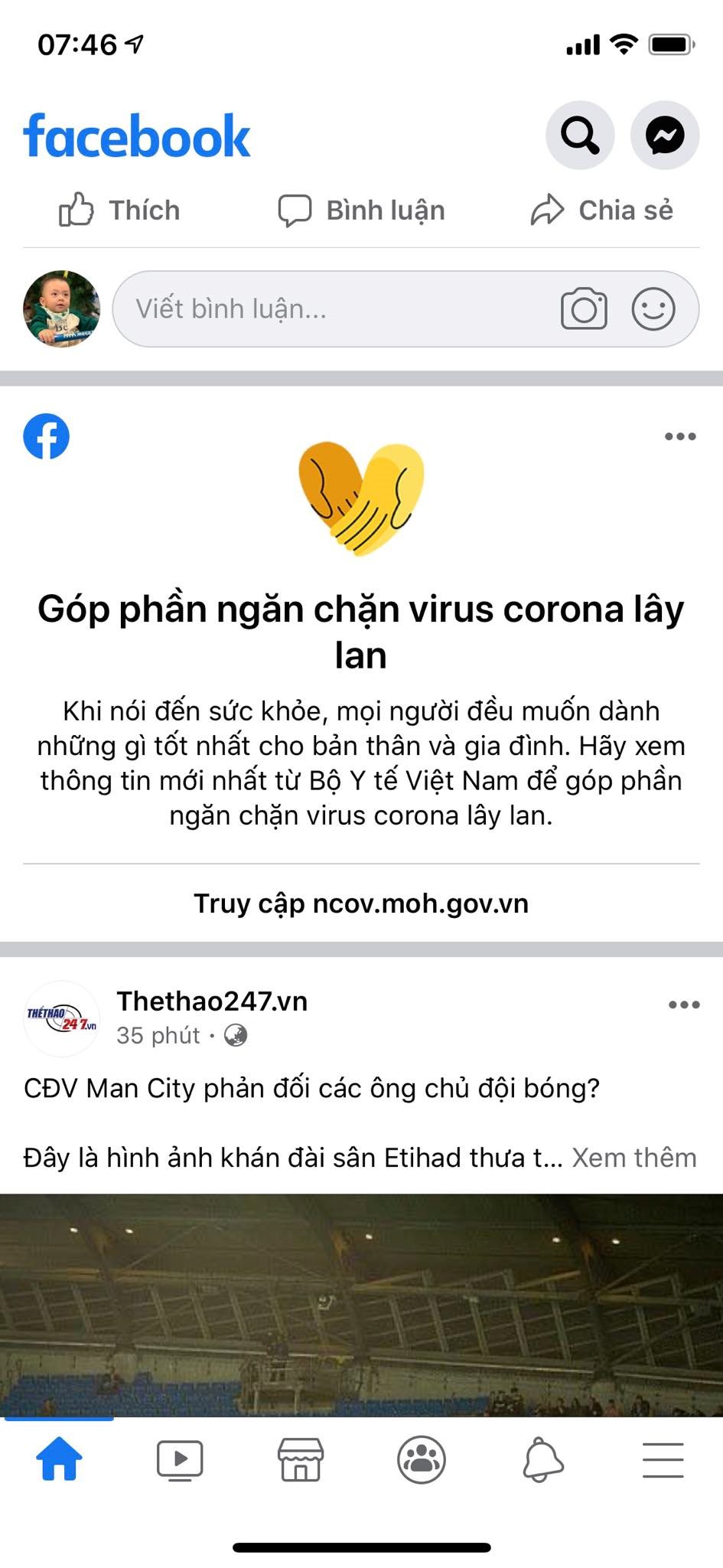 Ngày 20/2/2020, Facebook đã đưa ra thông báo đến những người dùng ở Việt Nam để góp phần ngăn chặn virus Corona lây lan bằng cách xem những thông tin mới nhất từ Cổng thông tin chuyên biệt về Covid-19. |