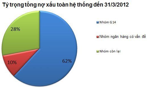 Ở phân vùng thứ hai, dữ liệu cập nhật đến 31/3/2012 cho thấy, nhóm G14 choán một phần rộng lớn của miếng bánh, chiếm tới 62%; đáng chú ý là nhóm ngân hàng “có vấn đề” chiếm 10%; nhóm còn lại chiếm 28%.