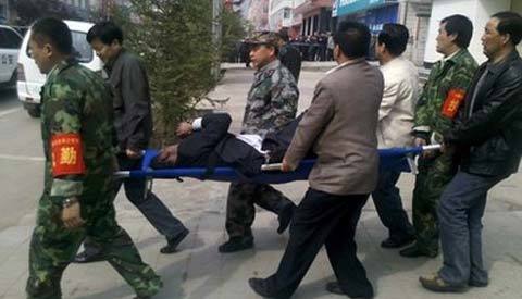| Một người bị thương trong vụ bom xăng được đưa ra xe cứu thương. (Ảnh: THX) |