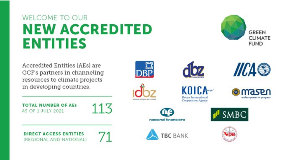 Tháng 7/2021, Hội đồng Quỹ Khí hậu xanh (GCF) đã chính thức công nhận Ngân hàng Phát triển Việt Nam trở thành Cơ quan Thực hiện Quốc gia (NIE) của GCF. GCF là một trong những Quỹ tài chính khí hậu lớn nhất thế giới, được thành lập vào năm 2010 trong Khuôn khổ Công ước khung của Liên hợp quốc về Biến đổi khí hậu với mục tiêu tạo lập một quỹ trị giá 100 tỷ USD để hỗ trợ cho những hoạt động giảm thiểu và thích ứng với biến đổi khí hậu trên phạm vi toàn cầu. Với vai trò là NIE của GCF, VDB sẽ thực hiện tìm kiếm, xây dựng và đệ trình các đề xuất cấp vốn của các chương trình, dự án thích ứng và giảm thiểu biến đối khí hậu đáp ứng được các tiêu chí của GCF và thực hiện giám sát, quản lý nguồn vốn từ quỹ này.