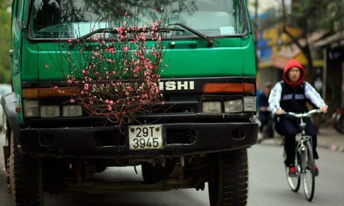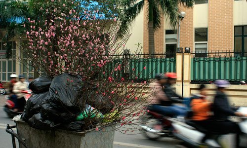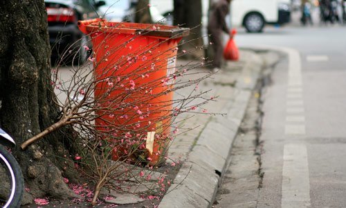 ý thức, bỏ lại cành đào chơi Tết bên ngoài thùng rác.