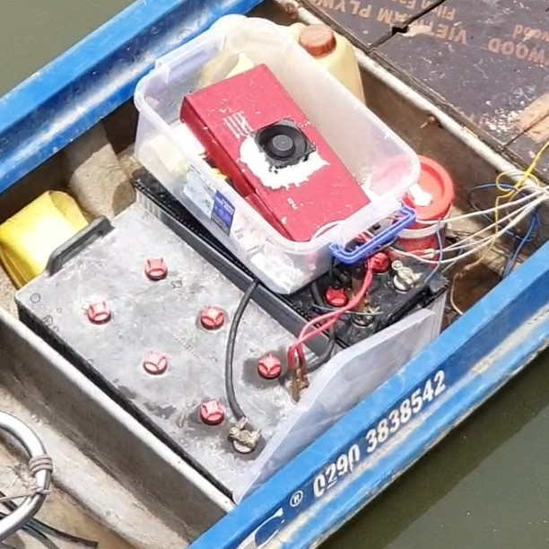 Hình ảnh người đàn ông gắn dây điện vào bình ắc quy để 'tận diệt' cá
