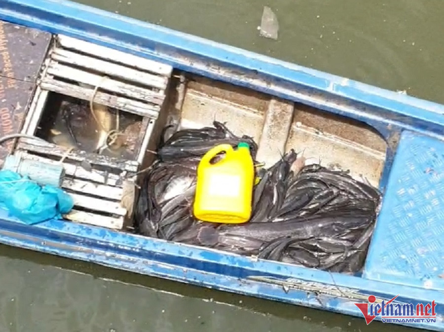 Những người đàn ông cho ghe cập mép kênh và di chuyển chậm lại, tay liên tục đưa cây vợt có gắn dây điện xuống mặt nước. Những con cá lớn nhỏ trúng điện vừa nổi lên, lập tức bị người trên ghe vớt lấy.