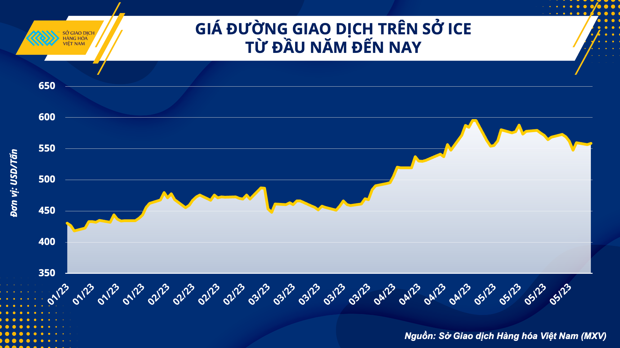 Theo Sở Giao dịch Hàng hóa Việt Nam (MXV), giá đường giao dịch trên Sở Liên lục địa New York (ICE US) tính đến ngày 30/05 ở mức 559,3 USD/tấn, duy trì ở vùng giá cao sau 12 năm. Đặc biệt, giá có sự nhảy vọt với mức tăng 34% so với thời điểm đầu năm, trong bối cảnh nguồn cung suy yếu tại các quốc gia sản xuất hàng đầu.